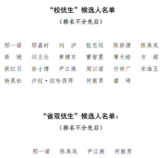 由班委会和团支部联合提名、班主任主持的班委会班干部初评,并广泛征求同学意见后,拟报邢一诺等22位同学为2023届“校优生”候选人,拟报陈禹岚等4位同学为“省双优生”候选人。