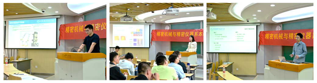 “六有大学生”21级硕士生麦贤龙同学向大家介绍了其所在实验室的研究方向和其在“基于磁流变技术的便刚度低功耗手部增强外骨骼”的研究工作,也向大家分享了其在研究方向的选择经历。22级博士生陈文捷同学进行了以“开阔思路,笃定目标”为主题的科研浅谈,介绍了所在课题组的研究方向和自己在超构表面检测环境折射率课题的研究工作。她还针对本科生学业规划的不同阶段,分享了自己的体会。21级博士生岳永铭同学对仿生机器人实验室方向进行了介绍,并结合自己科研、学习、比赛的实际经历向大家分享他的心路历程。三位同学结合自身经历,介绍了多年科研和学习中积淀的宝贵经验和心得体会,并对学弟学妹们可能会遇到的问题进行提醒和讲解。