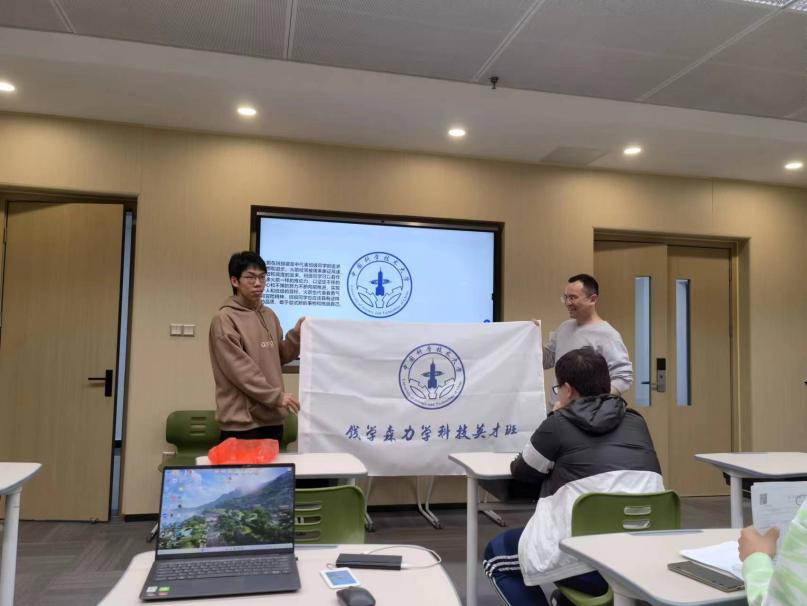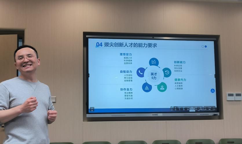 范煜老师也对班徽提出了自己的解读,阐释了班徽元素向中国航天之父、我系首任系主任钱学森先生致敬的寓意,并且也希望同学们提出更多样的见解,共同参加班级文化建设。他还介绍了自己思考的面向拔尖创新人才培养的“英才五力”,即理想定力、内驱动力、协作合力、创新能力和健康内力。他强调在大学的学习,知识学习不是全部更不是目的,价值塑造和能力培养相比知识学习更为重要,他勉励同学们要树立远大目标、注重能力提升,努力成长为德才兼备、全面发展的拔尖创新人才。