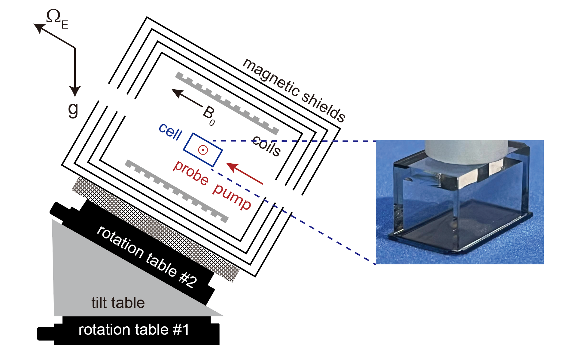 图 2 原子器件受多层磁屏蔽保护,其量子化轴指向由转动-倾斜系列平台控制。原子器件(放大图)为充有铷原子蒸气和两种氙同位素气体的气室,内部尺寸为10´8´8毫米。