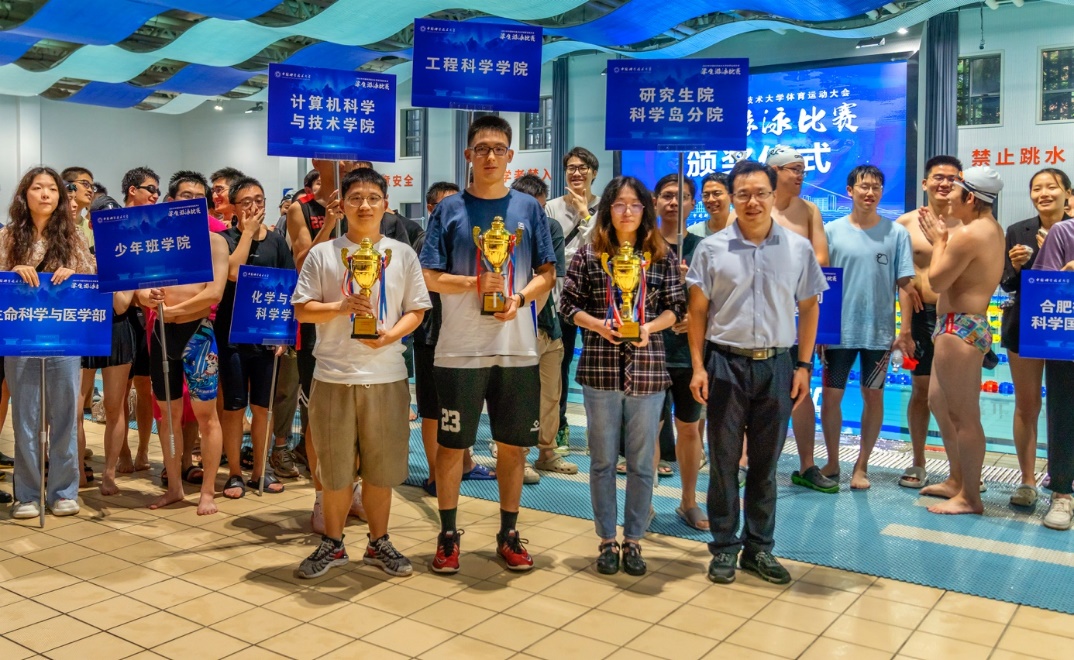 6月18日,中国科大学生游泳比赛在中校区室内游泳馆举行,我院24名队员组成的学生代表队累计报名参加了17个项目,包括50米、100米、200米等距离的个人单项和团体接力项目,涵盖蝶泳、仰泳、蛙泳与自由泳四种泳姿,并凭借出色表现,斩获了团体总分第一的优异成绩。其中柴琎同学在男子100米仰泳和男子100米蝶泳两个项目中大幅度打破原有校纪录,余雨坤同学在女子100米仰泳项目中打破校纪录,可喜可贺!