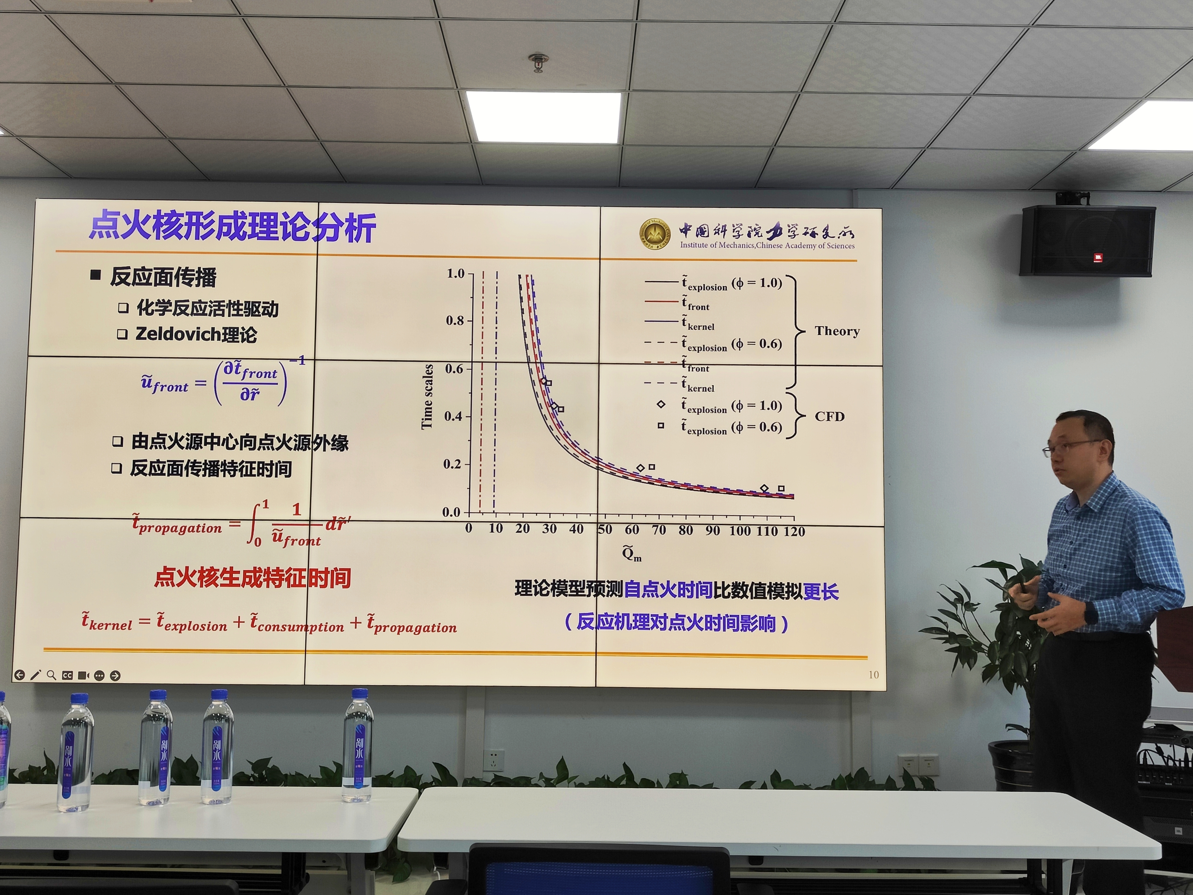 于德海副研究员的报告题目是“非稳态预混火焰点火理论研究”。先进推进系统运行过程中面临极限燃烧情况,比如内燃机贫燃与稀释燃烧,航空发动机高空点火,超燃冲压发动机高速点火。预混点火是开启燃烧状态的核心机制,相关研究具有重要的科学价值和工程指导意义。于德海副研究员面向燃烧基础理论问题,基于经典点火理论研究基础,探索非稳态效应对预混火焰点火过程的影响规律。针对静止预混可燃气,提出非稳态预混火焰点火理论模型,其合理表征在有限尺度与持续时间的外部点火源驱动作用下,点火核的形成与演化特征,并揭示了最小点火能量随点火源释热速率的变化规律。