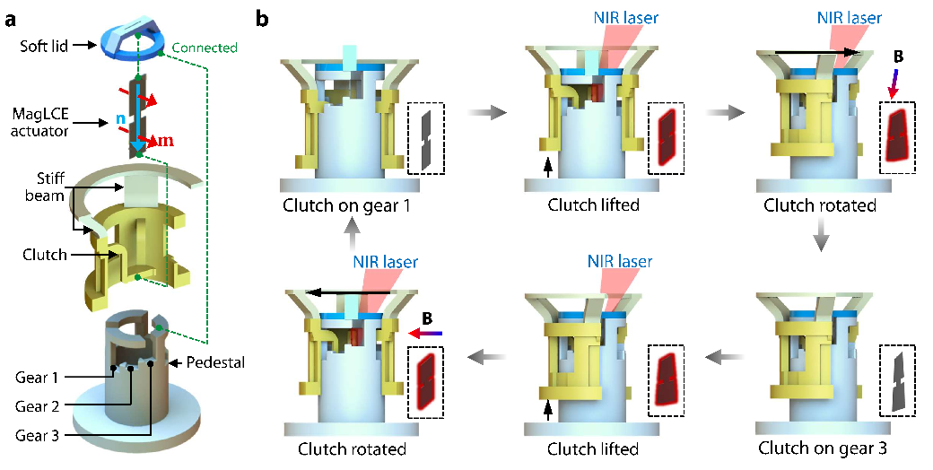 本研究的结果表明,物理场辅助的3D打印可以大大拓宽以铁磁液晶弹性体为代表的多功能域材料的制造与编程能力,进而在不同外场刺激下实现可控的多模式响应,对软体机器人、柔性电子、超材料等领域的发展起到推动作用。