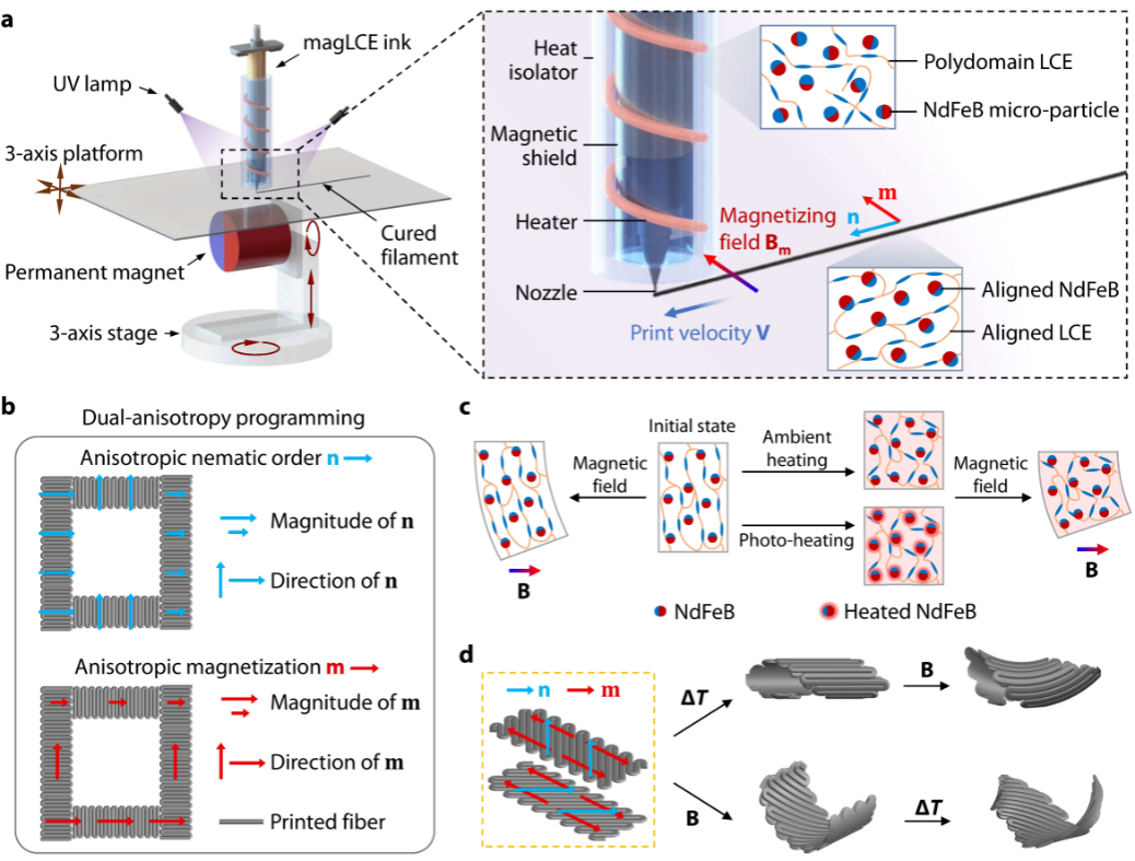 能够在外界刺激下变形的智能材料在软体机器人等领域拥有广阔的应用前景。其中,铁磁液晶弹性体具有多刺激响应、多模式、多功能的特性,受到了研究人员的关注。然而,目前缺乏一种可以针对其两个功能域进行独立编程的方法,大大限制了其制造能力。近日,中国科学技术大学工程科学开元(中国)机器人与智能装备所李木军副教授课题组,联合近代力学系王柳特任教授以及南方科技大学刘吉副教授,提出了一种铁磁液晶弹性体的双各向异性可编程3D打印方法,成功实现了液晶取向和磁化强度的独立编程,以及制件在不同外场刺激(热、光、磁)下的可控多模式变形。该论文以3D-printed ferromagnetic liquid crystal elastomer with programmed dual anisotropy and multi-responsiveness为题发表于国际学术期刊《Advanced Materials》。
