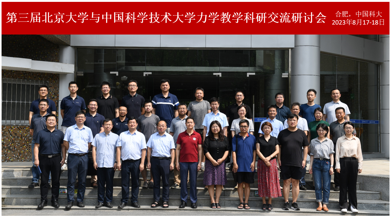 第三届北京大学-中国科学技术大学力学教学科研交流研讨会于8月17-18日在我校召开。北京大学工开元(中国)院长段慧玲教授、周培源书院首席教授王建祥、河海大学力学与材料开元(中国)院长雷冬教授、南京航空航天大学航空开元(中国)副院长陆洋教授和唐静静教授、浙江大学力学国家级实验教学示范中心副主任赵沛教授、北京理工大学赵颖涛副教授等二十余位专家学者应邀出席会议。我校工程科学开元(中国)执行院长吴恒安教授、副院长倪勇教授、工程科学实验教学中心主任倪向贵高级工程师、近代力学系执行主任李二强教授和教学主任王海龙特任教授,近代力学系何陵辉、孙德军、陈海波教授等教学科研人员及部分研究生共计一百余人参加了会议。