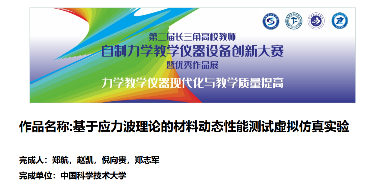 2023年8月23-24日,由长三角力学共同体(江苏省力学学会、安徽省力学学会、上海市力学学会、浙江省力学学会)主办,宁波大学承办的第二届长三角高校教师自制力学教学仪器设备创新大赛决赛中,我院工程科学实验教学中心郑航工程师团队提交的参赛作品“基于应力波理论的材料动态性能测试虚拟仿真实验”以第4名成绩荣获二等奖。