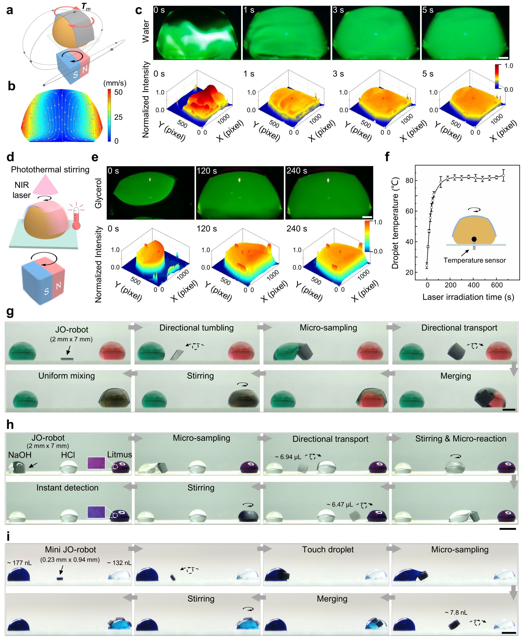 图2.基于磁响应双面神折纸机器人的液滴搅拌、光热搅拌以及多功能液滴操纵集成