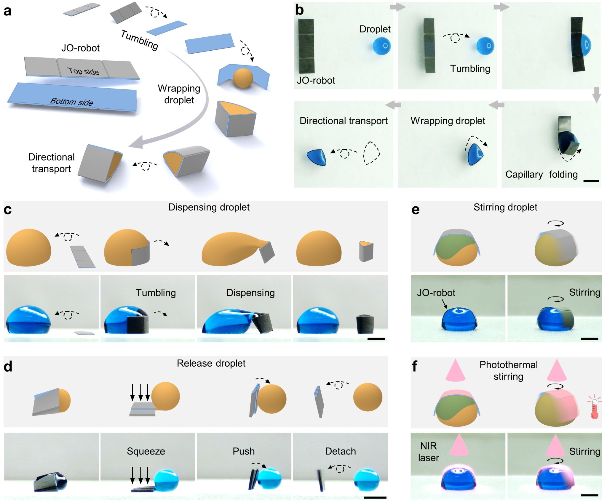 图1.磁响应双面神折纸机器人及其多功能液滴操纵应用