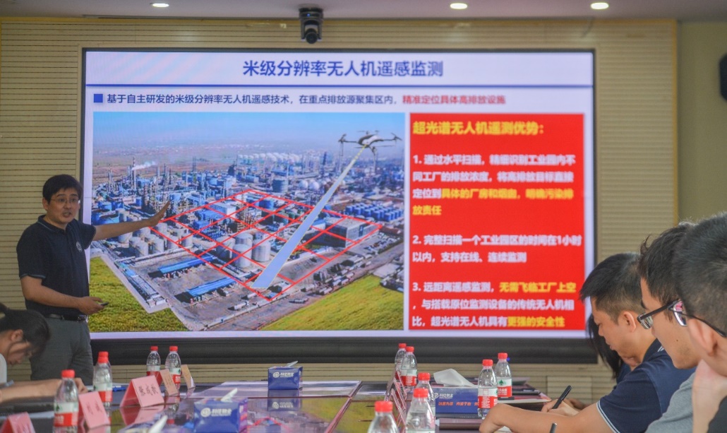随后,刘诚教授详细介绍了“天空地一体化超光谱遥感”,讲述了卫星国产化的过程,监测数据更准确;无人机超光谱遥感,延续了卫星的部分优势,同时展现了高分辨率和实时性的优势;地基超光谱遥感能实现水平监测、垂直监测和靶向成像。刘军副主任和唐浩华站长对超光谱技术给予了高度的肯定,希望后续能进一步合作。