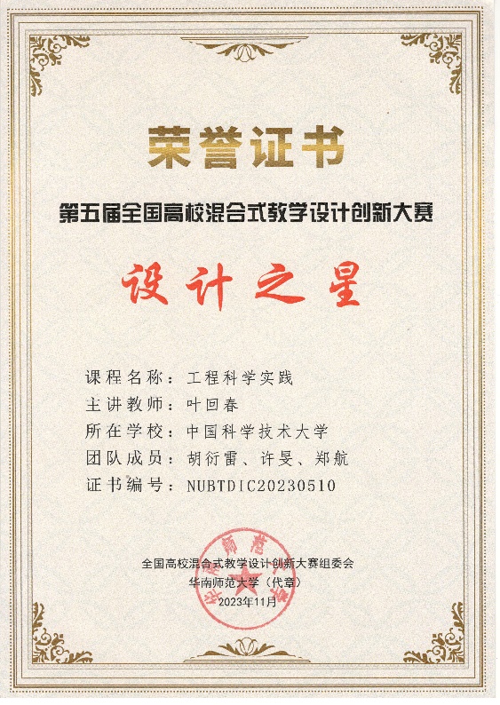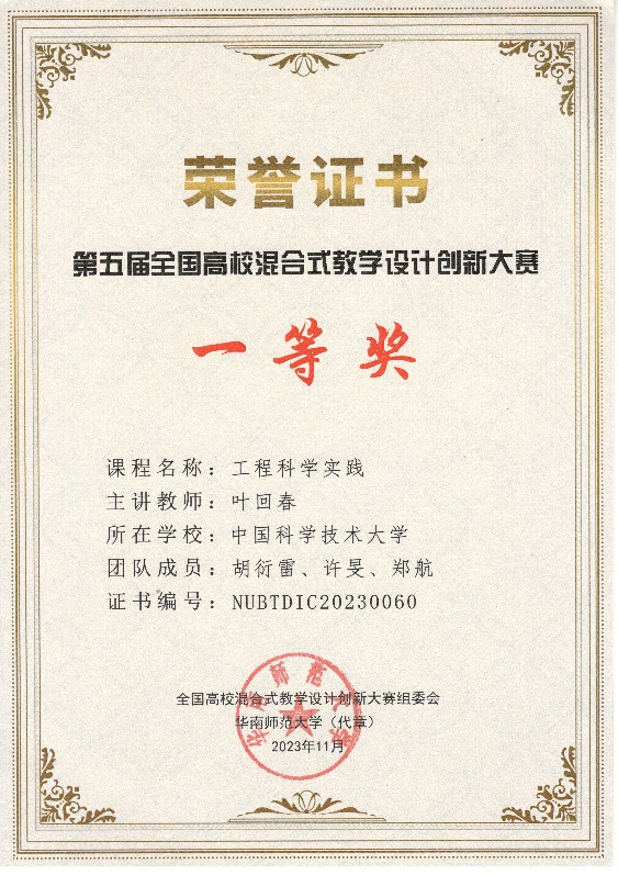 近日,“第五届全国高校混合式教学设计创新大赛”在华南师范大学广州校区石牌校园落下帷幕,我校工程科学开元(中国)叶回春老师主讲的《工程科学实践》课程荣获全国赛一等奖,并荣获“设计之星”称号,团队成员为胡衍雷、许旻、郑航。