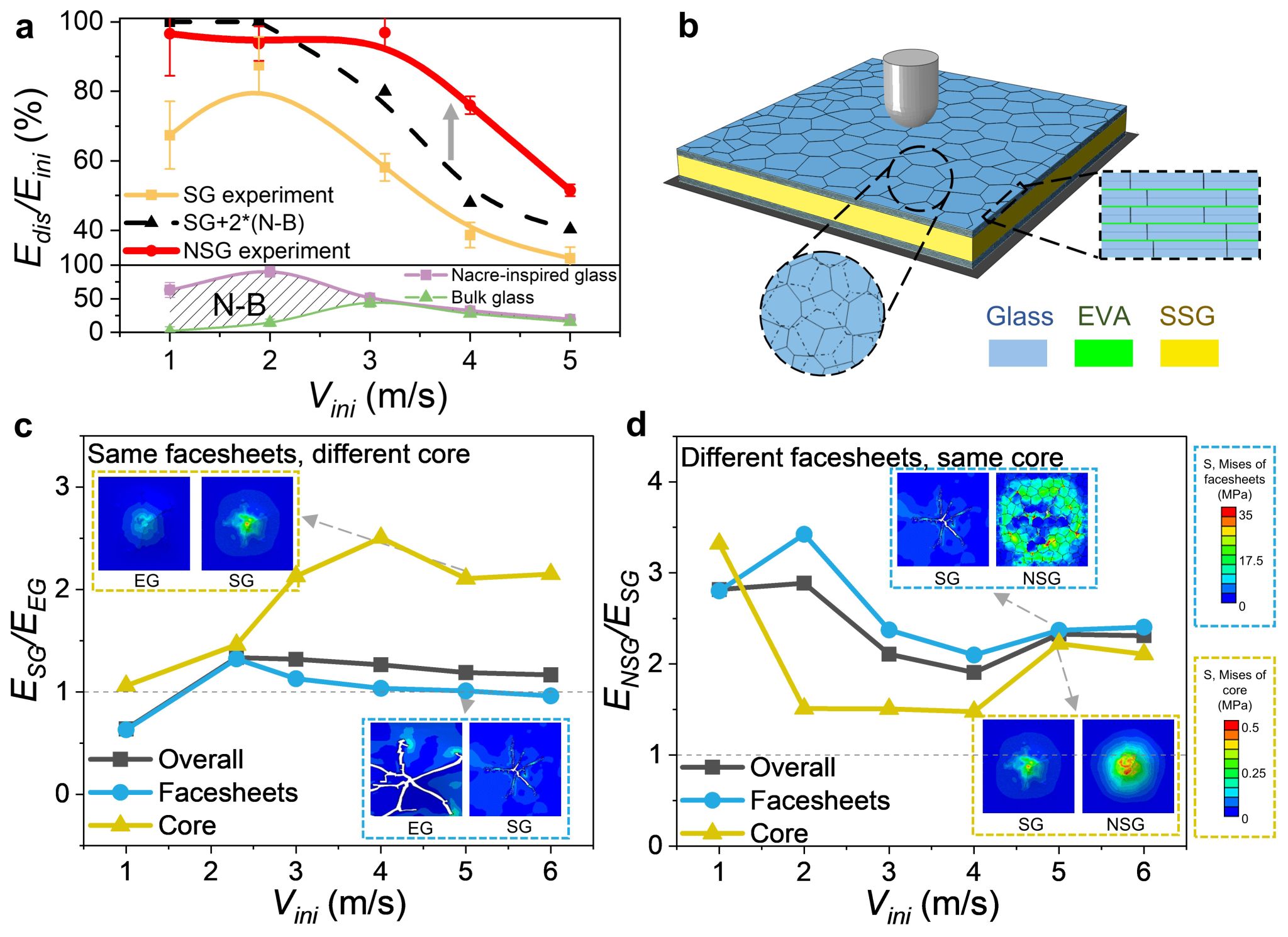 自然贝壳中的珍珠层在准静态或低速冲击加载下,能够通过砖块滑动机制耗散能量。然而随着冲击速度的增大,仿贝壳结构的抗冲击性能提升有限(图1a)。相反,剪切变硬材料在冲击加载下会显示出应变率相关的增强效应,能够在高速冲击下耗散大量冲击动能(图1b)。在深入理解仿贝壳结构与剪切变硬材料的率相关力学性能的基础上,研究团队构建了仿生复合玻璃材料。该材料结合了仿贝壳结构的低速抗冲击性能优势与剪切变硬材料的应变率强化性能优势,力学仿真分析发现仿贝壳结构面板的离域化变形可以进一步促进剪切变硬夹芯层的大范围损伤耗能。仿贝壳结构与剪切变硬材料的协同耗能作用,显示出1+1>2的效应,使复合玻璃在更大范围的冲击速度下呈现出更好的抗冲击性能(图2)。