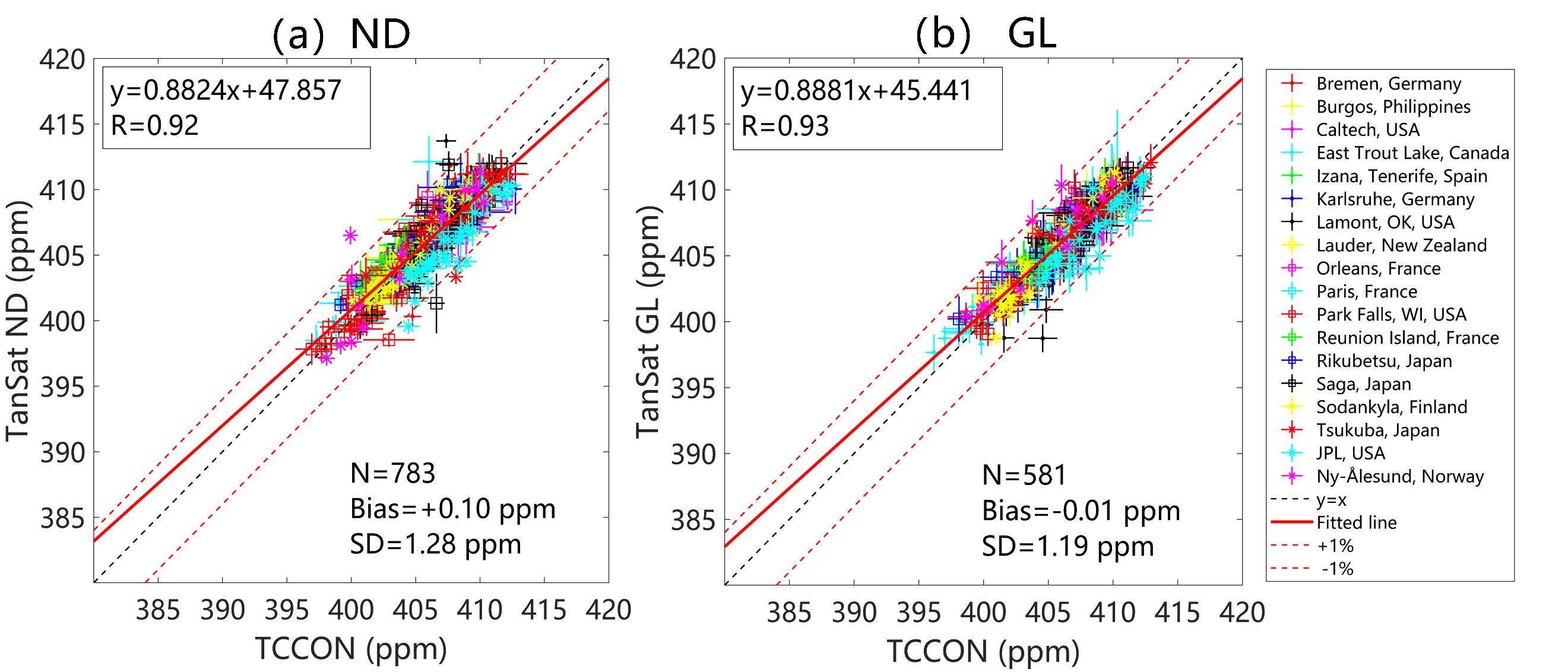 图2 TanSat CO2结果与地基观测网络TCCON的对比验证