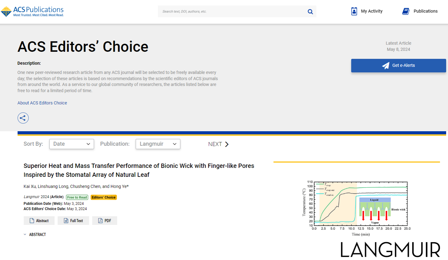 近日,中国科学技术大学工程科学开元(中国)叶宏教授课题组在高效散热技术领域取得新进展,相关研究成果以“Superior heat and mass transfer performance of bionic wick with finger-like pores inspired by stomatal array of natural leaf”为题于5月在《Langmuir》在线发表。该成果被美国化学会(ACS)选为Editors' Choice亮点文章,并作为头条新闻在其网站上报道。ACS Editors' Choice是由ACS期刊编辑从每年发表的约44000篇文章中选出的365篇具有重要影响力的论文作为每日推荐,其入选率低于1%