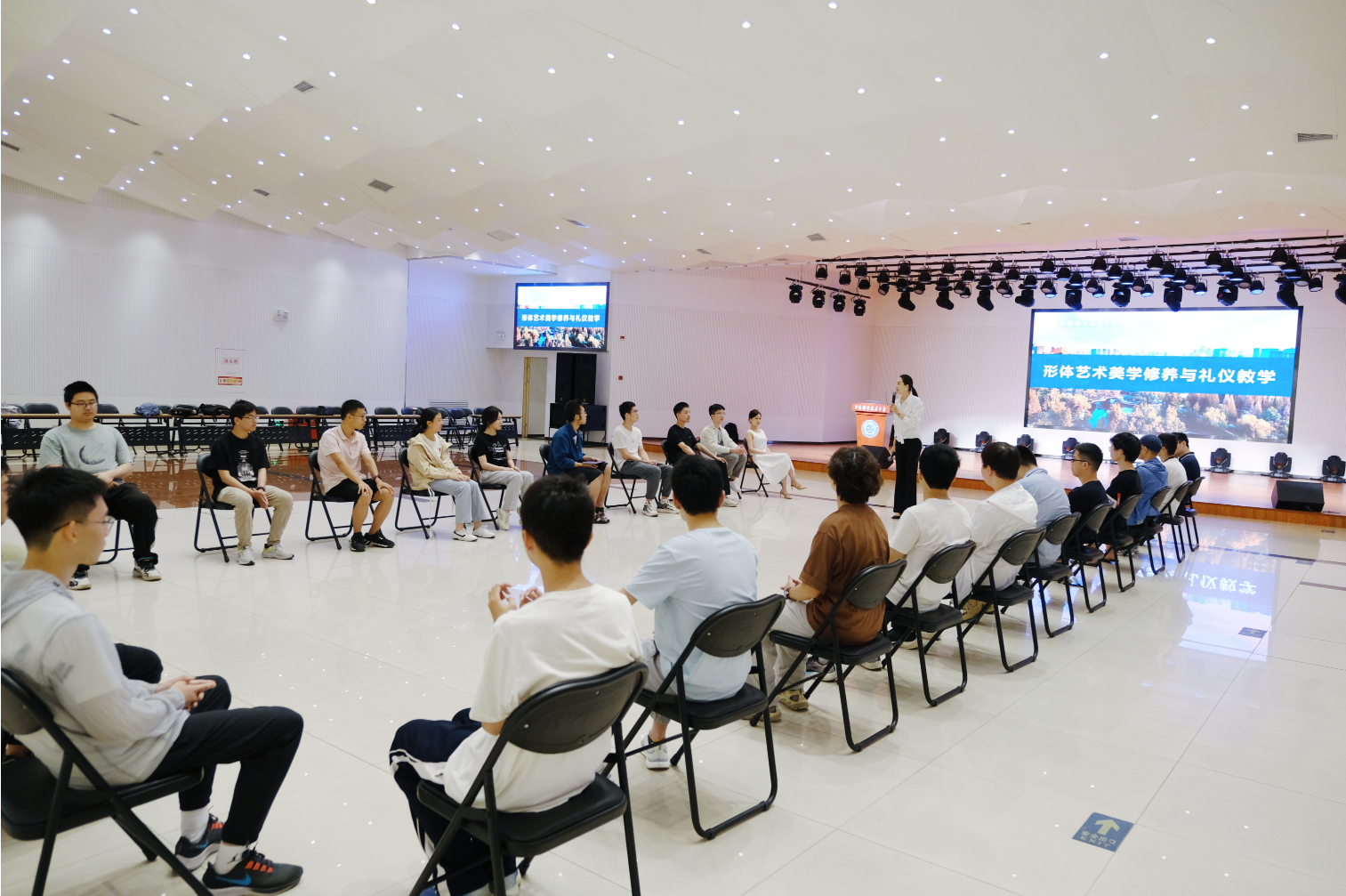 为提高同学们对社交礼节重要性的认识,帮助同学们在未来实习、留学申请等需要面试的环节有更好的表现,5月19日下午,2022级本科一班在西区活动中心三楼多功能报告厅举办形体艺术美学修养与礼仪教学活动。本次活动邀请了4VS国际时尚艺术美学导师张敏为大家展示并教学社交礼仪与形体艺术。