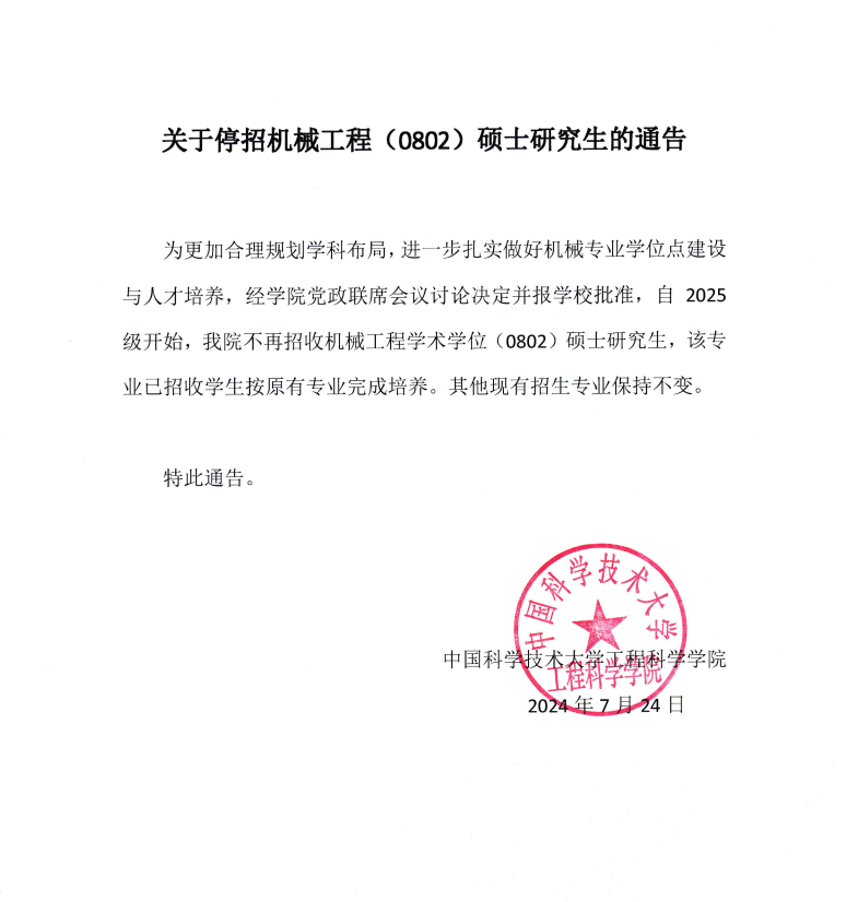 关于停招机械工程(0802)硕士研究生的通告