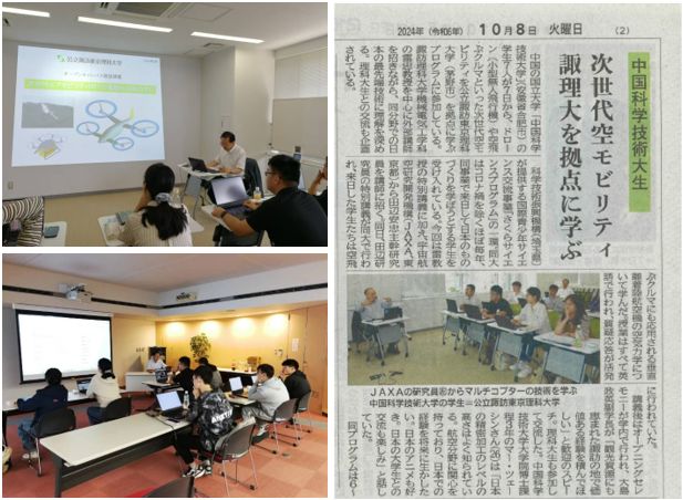 公立诹访东京理科大学,雷忠教授和日本宇宙航空研究开发机构(JAXA的田边安忠研究员给同学们讲授了航空飞行器的发展现状以及研究重点。其中,雷忠老师重点介绍了电动低空飞行器的总体设计与电机设计,以及在设计过程中需要考虑的多目标优化问题,如机翼结构强度、飞行性能以及能量损耗等。田边安忠研究员重点介绍了电动垂直起降飞行器(eVTOL)在实际使用过程面临的问题,如多翼控制、贴壁飞行、噪音产生以及姿态控制等。课堂上,老师们抛出疑问,同学们深入思考,在自由活跃的课堂氛围中,同学们进一步了解了目前电动低空飞行器的研究现状与发展前景。