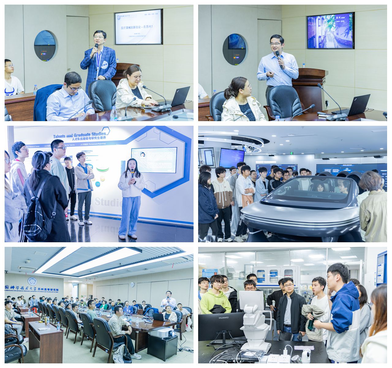 在苏州高等研究院,苏高院党政办公室主任钟逸向同学们介绍了苏州的自然人文风光和苏州高研院的建设发展历程,徐晓嵘教授介绍了iMED中心在生命医疗仪器与医疗器械方向的前沿进展。在工作人员的带领下,同学们先后参观了智能医疗器械研究中心和医学影像智能与机器人研究中心,了解关于生物先进制造、穿戴设备、血管工程和微纳制造等前沿领域的研究工作,对当前生命医疗科学前沿进展和未来发展方向加深了理解。