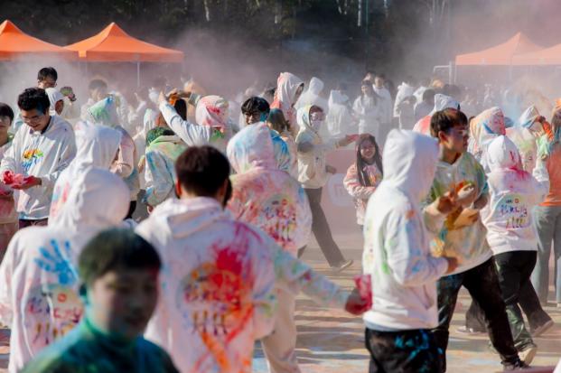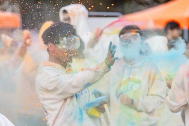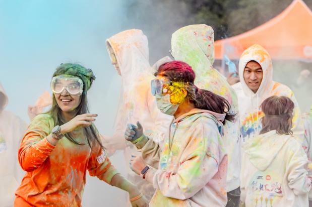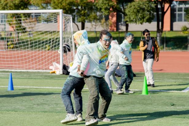 与此同时,最受期待的“彩虹狂欢”也在操场正中央分批进行,现场师生手持彩粉袋,纷纷进入“狂欢区”场地,欢笑声、呐喊声充斥场地,大家用彩粉释放压力,互相泼洒、涂抹,整个操场瞬间变成了一个五彩斑斓的欢乐海洋,周围的空气中弥漫着彩粉,就像是被带入了一个色彩的世界,五彩的粉末在空中飘扬,形成一道道美丽的彩虹。