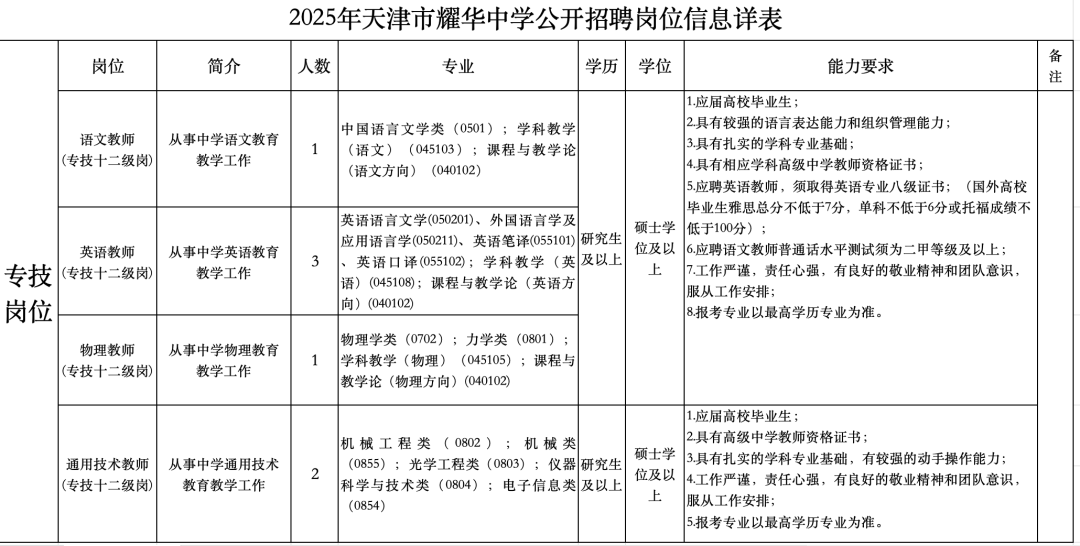 2025年天津市耀华中学公开招聘岗位信息详表