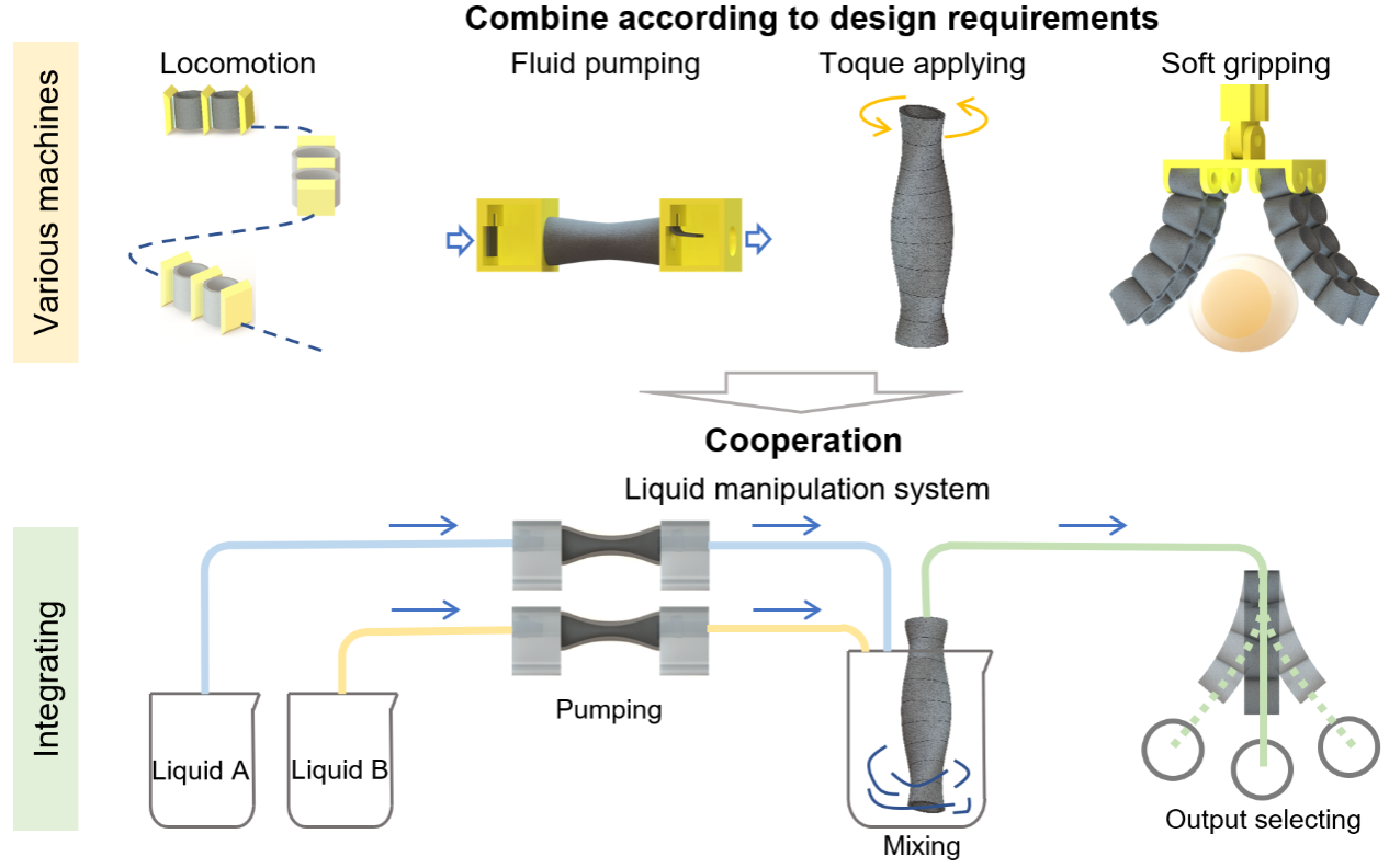 该设计方法实现了磁控软机器人的多场景应用,包括顺应性柔性抓取、软体机器人、流体系统等,拓展了磁控软机器人的应用潜力。研究团队使用收缩模态单元设计了无绳驱动的爬行机器人,可实现速度和方向可控的爬行运动。此外还利用收缩模态单元设计了磁控软泵,避免了传统机械泵的磨损和锈蚀问题,且与电控系统隔离从而避免了在潮湿环境下使用的漏电等危险。利用弯曲模态单元设计的磁控软抓手,具有很强的形状适应性,能够轻松抓取蒲公英、生鹌鹑蛋、鲜花、薯片等脆弱和易变形物体。而利用扭转单元设计的扭转机构,则可以在弯曲狭窄的管道里拆卸螺钉。此外,研究团队还将不同变形模态的单元集成到一个流体系统中,实现泵送、搅拌、输出选择的协同工作。最后,研究团队还可将单元尺寸缩小到微米级,利用收缩和弯曲单元设计了毫米级的磁控钩爪,可深入窄缝中勾取掉落的物品。