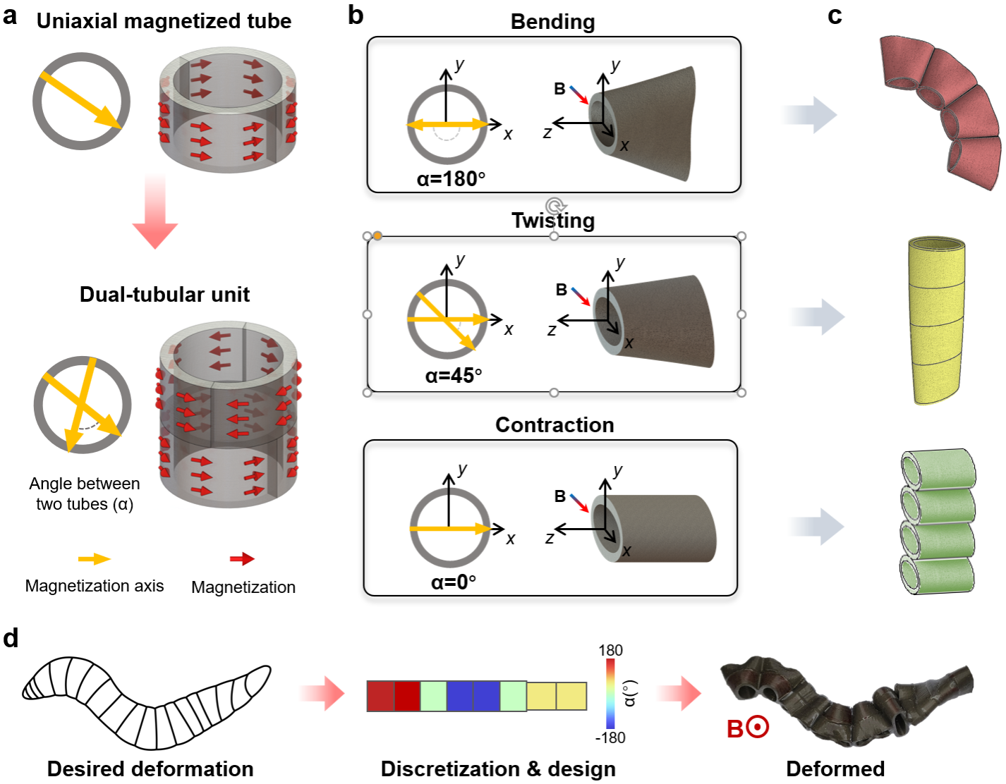 磁驱动软机器人因其无线可控性、快速响应性和生物安全性在生物医学、机器人和仿生学中得到广泛应用。然而,由于软材料变形的高度非线性和极大自由度,软体机器人的变形和运动控制一直是一个挑战。研究团队受蚯蚓等环节动物的节结构启发,提出了一种具有多模态变形的磁驱动单元,单元集成了收缩、弯曲、扭转、体积变化等多种变形模式,不同变形模式的单元可由同一匀强磁场驱动,从而实现了磁性软材料的简便编程设计,成功解决了磁控软机器人的逆变形设计问题。该工作提出的模块集成设计策略具有多功能性和便利性,推动了硬磁性软材料在智能和集成机械系统中的应用。