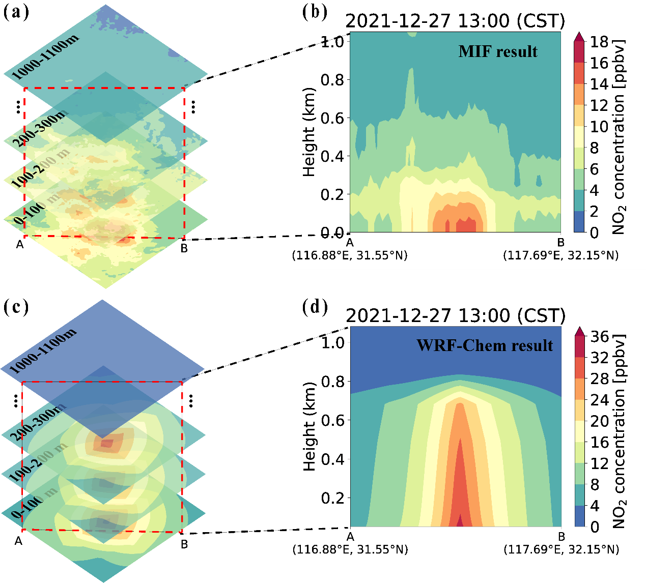 图2. 二氧化氮重建结果与模式模拟二氧化氮结果。其中(b)展示了重建结果识别到的污染物高空传输现象