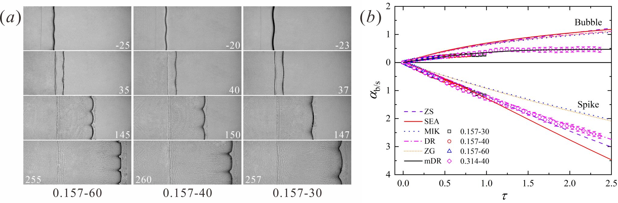 图2. (a) 强激波诱导轻-重单模界面演化的典型实验图像。图中数字表示不同时刻,单位为µs,三组工况对应ka0-λ,其中k、a0及λ分别表示界面扰动的波数、初始振幅及波长;(b) 界面结构(尖钉和气泡)振幅演化的实验观测和理论预测对比。