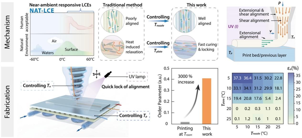近日,中国科学技术大学工程科学开元(中国)、人形机器人研究院的李木军副教授,联合张世武教授等研究人员,在智能材料3D打印领域取得重要进展。研究团队提出复合冷场3D打印技术,成功制备具有高取向序参数和多元形变能力的近环境温度响应液晶弹性体(NAT-LCEs),并基于此开发出心率监测精度显著提升的智能腕带系统。成果以“3D Printing of Near-Ambient Responsive Liquid Crystal Elastomers with Enhanced Nematic Order and Pluralized Transformation”为题发表于期刊《美国化学学会纳米杂志》(ACS Nano)上。