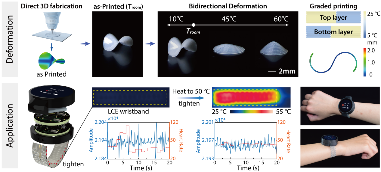液晶弹性体作为新型智能材料,在软体机器人、生物医学设备和可穿戴电子领域具有重要应用价值。传统液晶弹性体存在响应温度高(>70℃)、制造工艺可编程性受限等瓶颈,严重制约其实际应用。开发具有近环境温度响应特性且可精密加工的新型液晶弹性体,成为该领域亟待突破的关键科学问题。针对该问题,研究团队创新性地提出“低温喷头+冷却平台”复合冷场协同调控策略,取得了多项技术突破:1、液晶基元取向的精准控制:通过5℃低温打印环境维持墨水高粘度,利用剪切力诱导液晶基元高度定向排列,使取向序参数较传统室温打印方法提升30倍以上。2、多元形变编程:实现鞍形、锥形、英文字母等复杂结构可逆变形。3、生物兼容应用:材料响应温度适配人体耐受范围,成功开发可主动贴合皮肤的智能心率监测腕带系统。