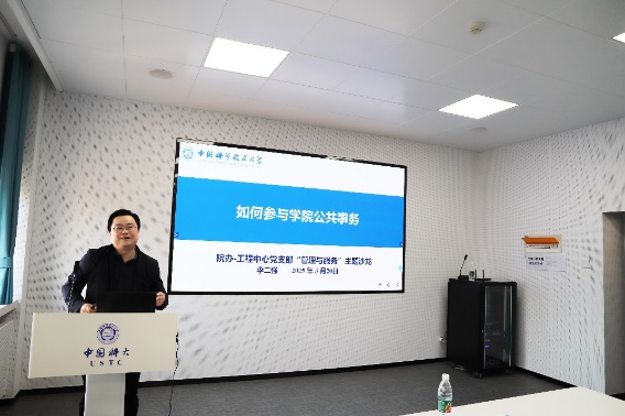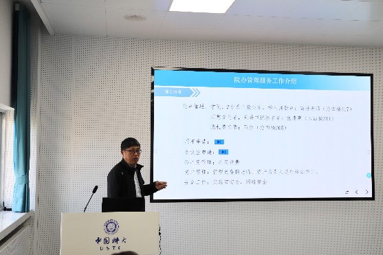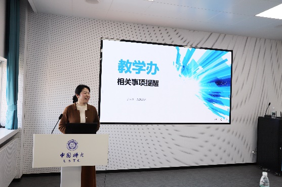 金熠介绍了工程与材料科学实验中心基本概况和为师生提供的测试服务项目;院团委副书记樊洋洋介绍了教师指导学生创新创业获取教学学时与学生工作经历的方法;教学主管余年琴介绍了新进教师授课、博导资格申请、硕博招生、大研大创指导等教学相关的工作;院办常务副主任王超全面介绍了院办管理服务职能和工作内容;合肥微尺度物质科学国家研究中心博士后孟祥森分享了自己在工程与材料科学实验中心老师帮助下完成高质量测试,助力科研工作的经历。