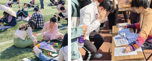 创意市集燃活力、手绘纸鸢展巧思。活动现场布置成春日游园会风格,设置“筝奇斗艳”手绘区、“春风闯关”游戏区和“追风补给站”。同学们在素白风筝上挥洒创意,绘制星空、校徽、卡通形象等图案。乒乓球五子棋、毛毛虫探球等游戏区欢声不断,笑意写在每位参与者脸上。