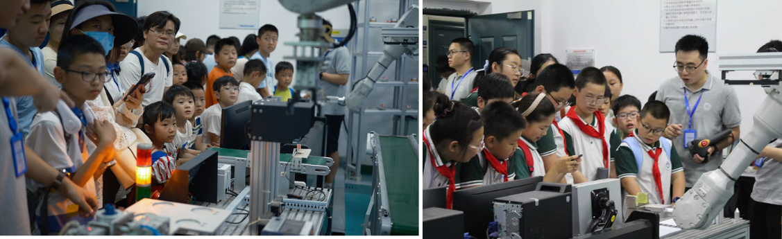 在力学二楼的工业机器人展区,一台六轴机械臂成为全场焦点。讲解员详细讲解了机器人的运动原理与控制系统,耐心解答孩子们提出的问题,如“机器人如何精准夹取工件?”“如何对齐螺孔?”等。现场演示中,机械臂流畅完成抓取、搬运、螺栓装配等任务,展现了智能制造的强大能力。特别设计的有趣环节中,一位幸运小朋友的名字被机械臂工整书写在纸上,引来阵阵掌声。这一互动不仅展示了机器人书写功能的趣味性,更让观众感受到工业机器人从“刚性生产”到“柔性制造”的技术飞跃。