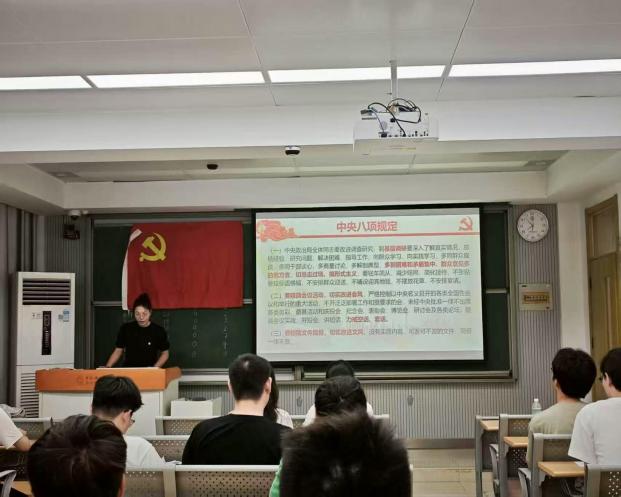 为深入贯彻落实党中央全面从严治党战略部署,切实增强党员的纪律意识和作风建设自觉性,6月25日晚,近代力学系2024级硕士生第一党支部在西校区3A104教室举办深入学习中央八项规定精神主题党课,支部书记王莉媛同志主讲。