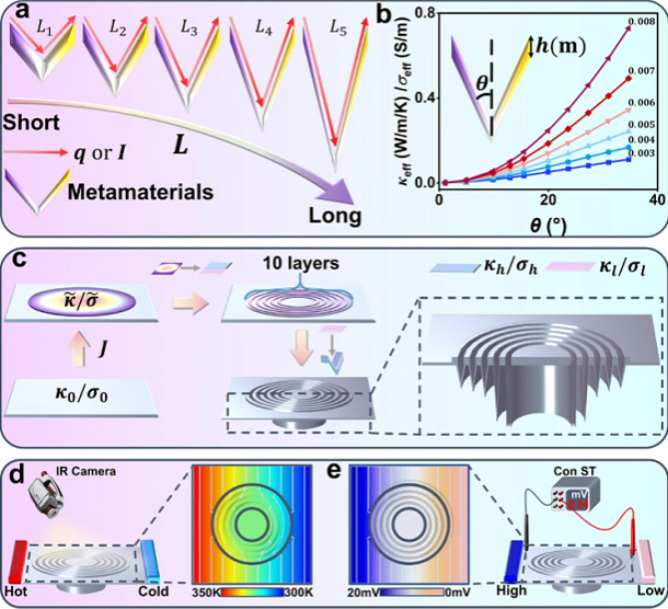 热超材料(Thermal Metamaterials)为人工设计热学材料,即通过材料热物性/几何结构设计来规划温度分布或者热流路径,以实现在热源及其附近区域的精准热管理。材料内热流与温度场是耦合的,因此热超材料设计理论上是一维的,即其功能目标只能规划温度分布或者热流路径。目前,热超材料研究一直围绕温度场分布展开的。近日,中国科大研究团队首次提出基于可折叠V形结构来规划热流3D路径的热超材料设计策略,研究结果以“ V‐Shaped 3D Electrothermal Dual‐Function Metamaterials: Dynamic Dual‐Field Cloak Through Geometric Transformation”为题,于6月25日在线发表在Advanced Functional Materials。该研究结果将为深入研究动态热超材料提出了切实可行的理论框架。