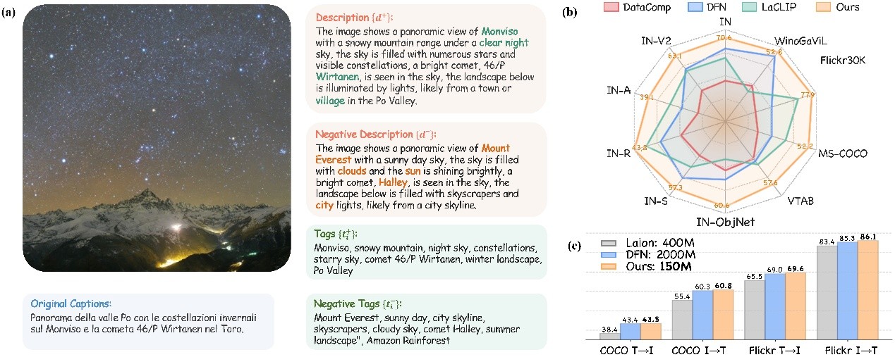 相关研究成果以“HQ-CLIP: Leveraging Large Vision-Language Models to Create High-Quality Image-Text Datasets and CLIP Models”为题发表于CCF-A人工智能顶会ICCV 2025。该结果对基于CLIP的多模态大模型训练具有重要的参考价值。