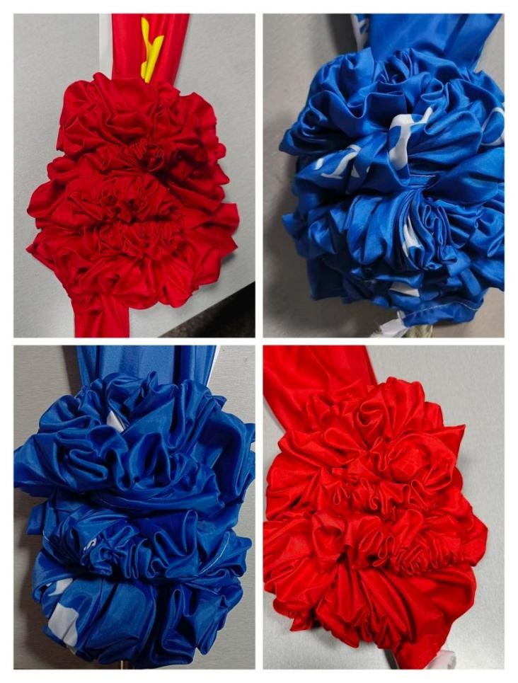 在分组实操环节,全班同学分为若干小组,每组配备一名护卫队成员进行“一对一”指导。同学们认真练习,从整理旗面到精准打结,再到扯出层次分明的花瓣,最终成功绑出一朵朵整齐美观的旗花,现场氛围热烈而有序。