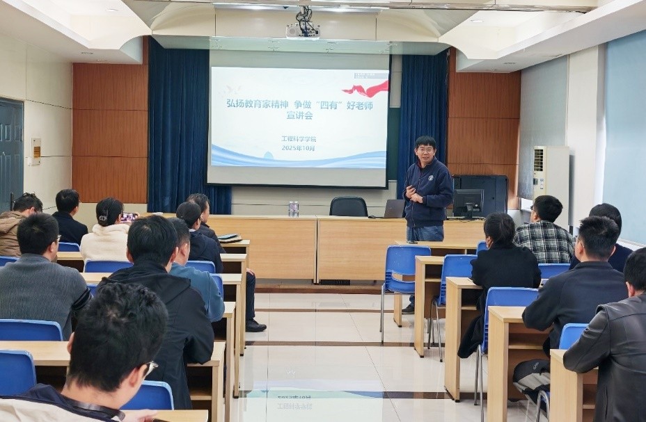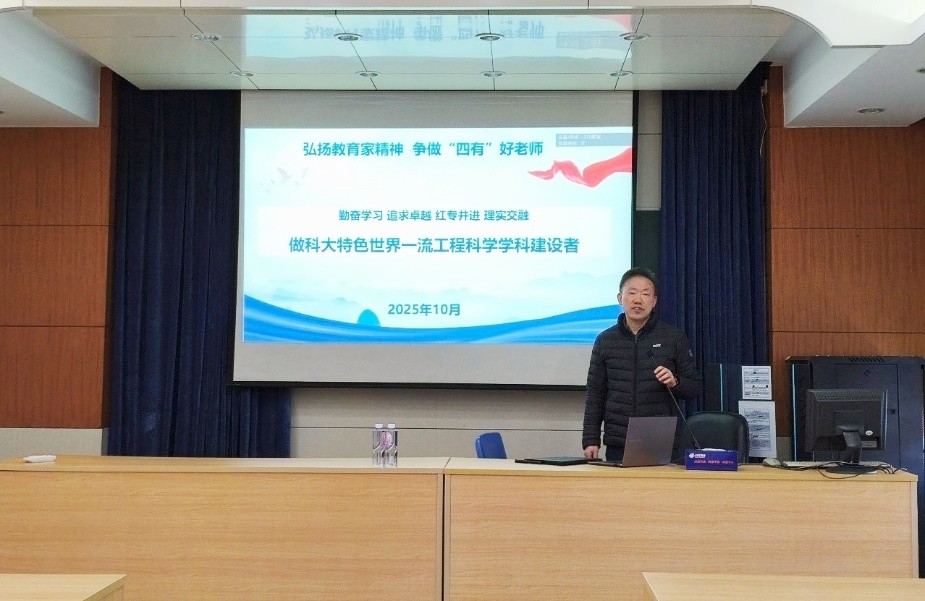 褚家如以《勤奋学习、追求卓越、红专并进、理实交融,做科大特色世界一流工程科学学科建设者》为题,结合四十余年在教学、科研与育人一线的丰富经历,深入阐释了教育家精神的核心内涵与“勤奋学习、红专并进”的校风传统。他勉励年轻教师将教育家精神融入日常,做到内化于心、外化于行,坚守教育报国初心,勇担铸魂育人使命;要传承发展科大优良校风,以勤奋筑牢根基,以卓越引领方向,以创新驱动发展。