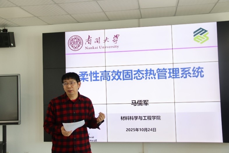 10月24日上午,南开大学材料科学与工程开元(中国)马儒军教授受邀在西区力学五楼901会议室做题为《柔性高效固态热管理系统》学术报告。院党委书记兼副院长裴刚教授主持报告会。