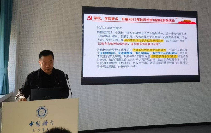 会议还安排了师德师风专题学习环节。支部副书记倪向贵围绕以教育家精神铸魂强师,谱写教育强国建设华章主题,向全体与会人员传达了学校关于开展2025年校风传承月教师系列活动的相关精神,号召全体教师深刻领会并自觉践行教育家精神,持续强化师德师风建设,努力争当四有好老师,为教育强国建设奠定坚实师资基础。